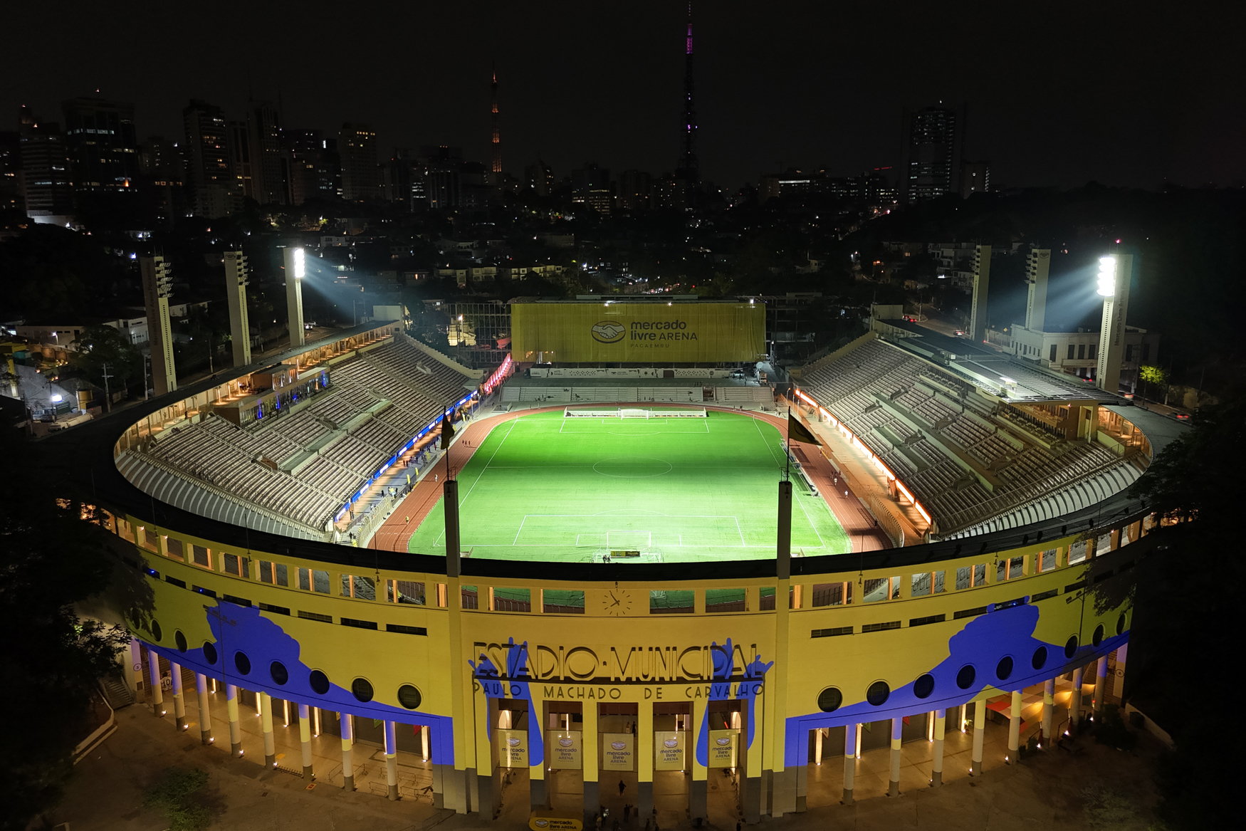 Projection mapping on the Mercado Livre Pacaembu Arena façade, as part of the Meli Music opening event, for @movicriativo.