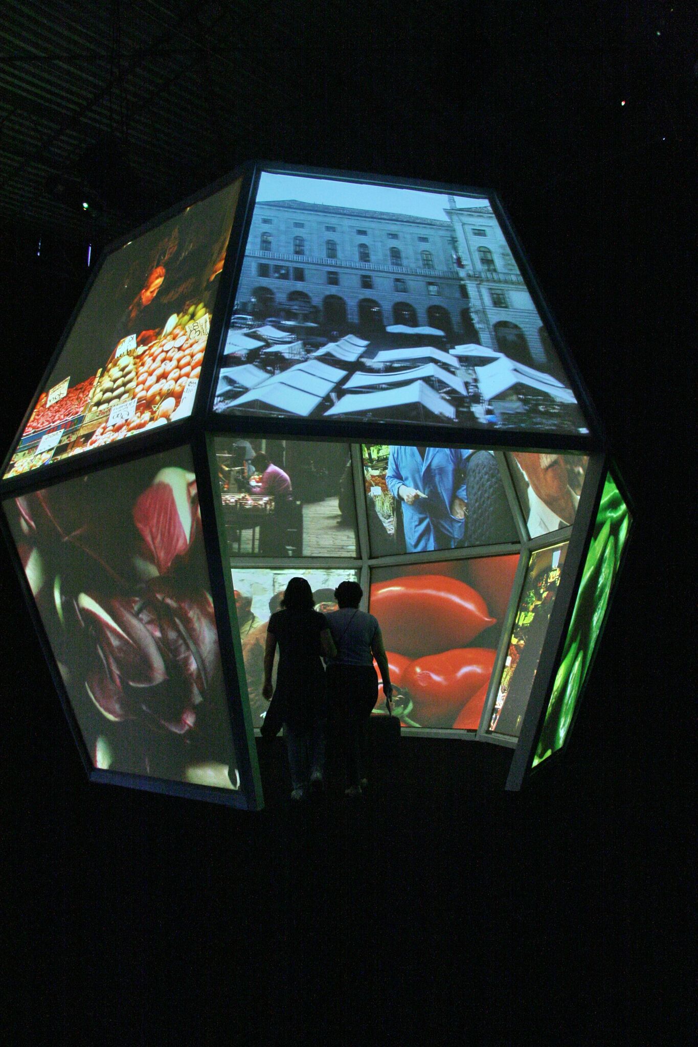 The installation was called "Sustainable Cities in Italian Style" and was composed of a multifaceted polyhedron in which scenes of urban life were projected, extracted from some small Italian cities considered an example of sustainable lifestyle.