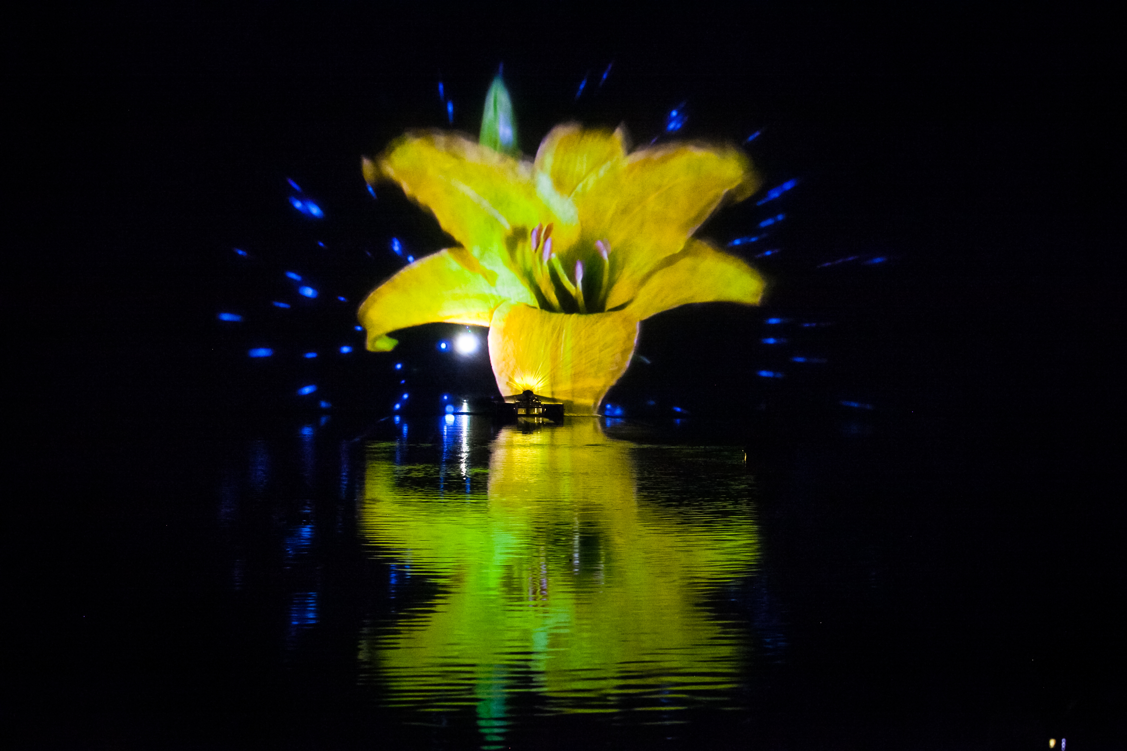 Water projection at the event to celebrate the 70th anniversary of the Grande Hotel Tauá in Araxá. A water pump and a projector of 30,000 ANSI lumens were used to reproduce the scenario of the "Páscoa Iluminada" presentation, held at the Hotel's lake. Projection with a height and fan of 40 meters.